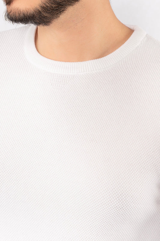 WHITE ROUND NECK PIQUET SWEATER